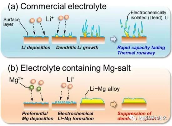 添加鎂鹽抑制鋰晶枝生成的示意圖: